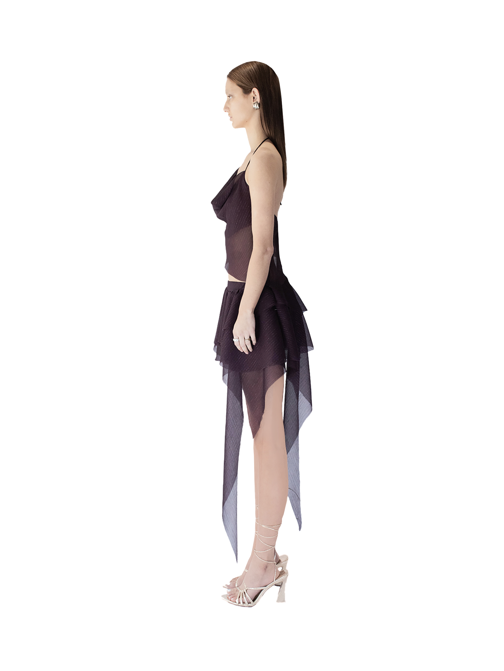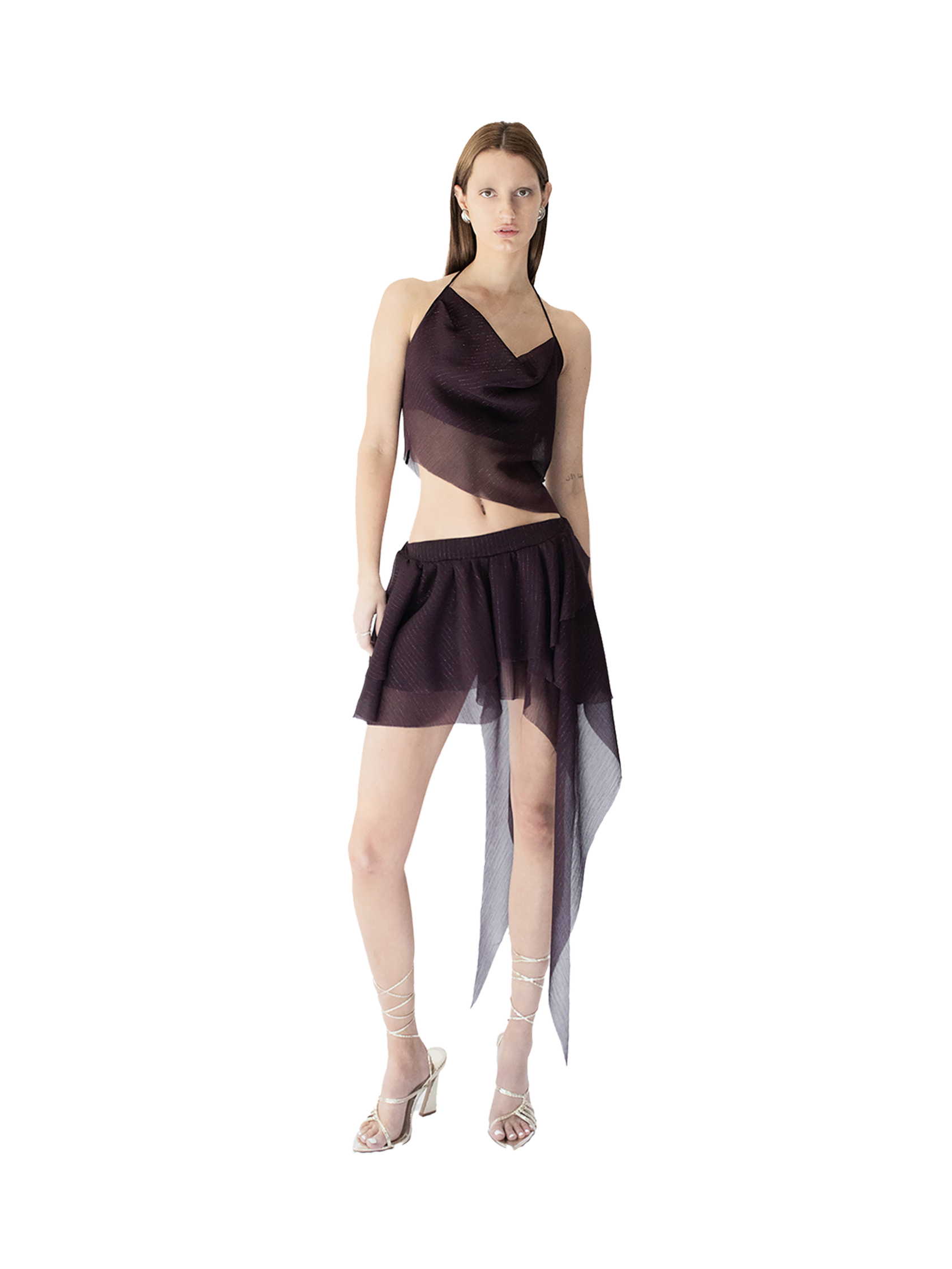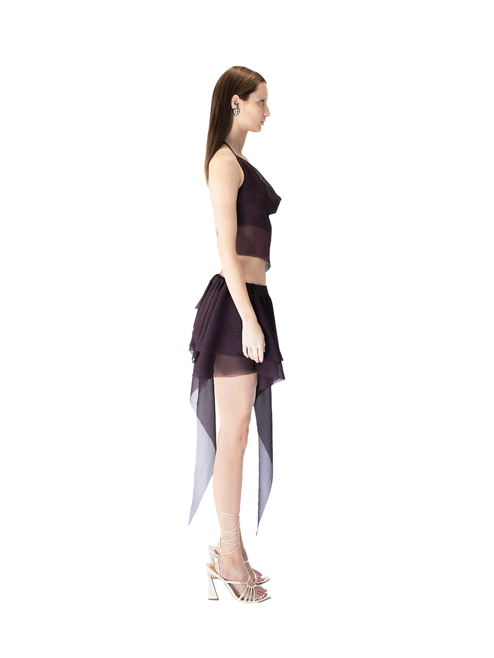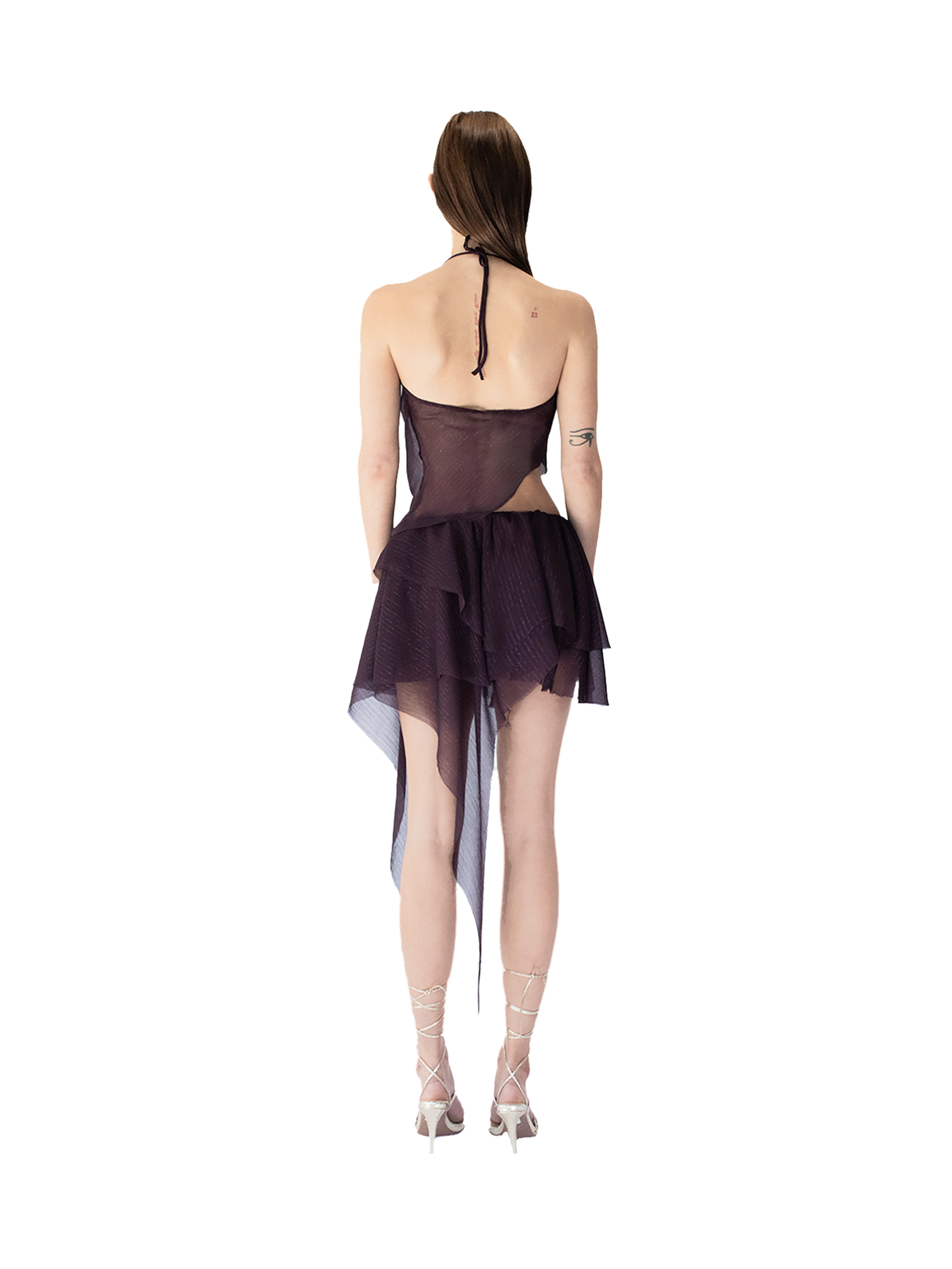 The PP Chiffon Tinkerbell mini skirt, featuring a mix of purple and black polyester, consists of a cowled neck top and an asymmetrical bottom skirt. The ensemble is enhanced by its shimmery, lightly striped fabric, lending a distinctive flair to the outfit.